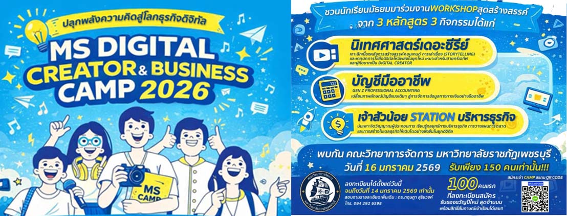 รับสมัครนักศึกษา สมัครเข้าศึกษาภาคปกติ สมัครเข้าศึกษาภาคนอกเวลา สมัครเข้าศึกษาระดับบัณฑิตศึกษา ข่าวสารประชาสัมพันธ์ ค่าย MS Digital (Creator & Business) CAMP 2026 25 December 2025 ขอแสดงความยินดีกับรศ.ดร.ธนัทเมศร์ วัชราพิบูลวงศ์ 19 December 2025 แสดงความยินดีกับอาจารย์ ดร.ณัฐอร มหาทำนุโชค ในโอกาสได้รับตำแหน่ง “ประธานสาขาวิชาการบริหารธุรกิจ” 20 November 2025 ขอแสดงความยินดีกับรองศาสตราจารย์ ดร.ธนัศเมศร์ วัชราพิบูลวงศ์ 4 November 2025 ดูข่าวสารทั้งหมด >> คณะวิทยาการจัดการ มหาวิทยาลัยราชภัฏเพชรบุรี Faculty of Management Science เพิ่มเติม สภาพแวดล้อมสนับสนุนการเรียนรู้ เพิ่มเติม